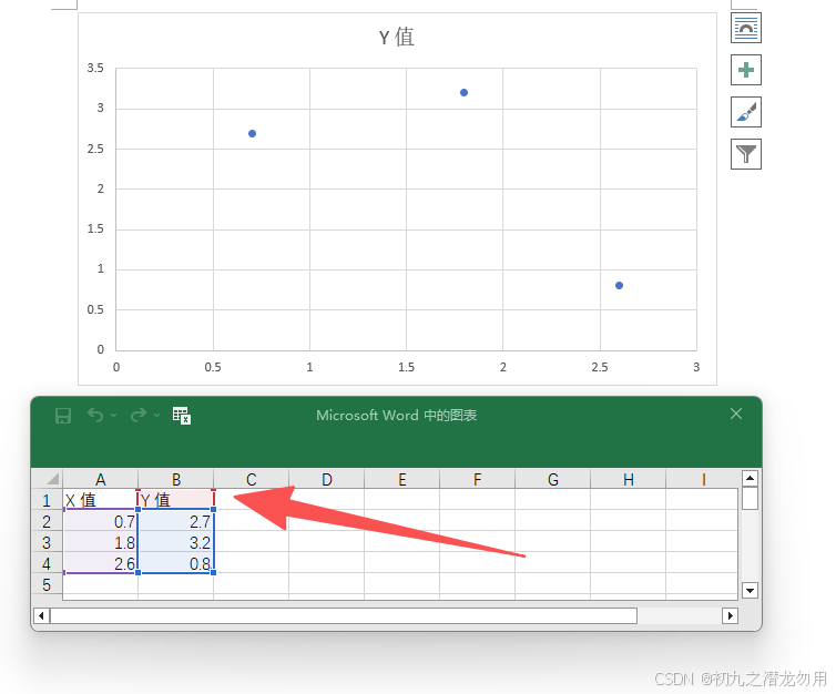 可以设置必要项,分类和系列1,而不会因为系列2的数据存在而出现错误,WORD会自动"忽略"。但最近在新需求应用中,使用一款散点类型图表时发现了一些问题,其EXCEL数据源如下: