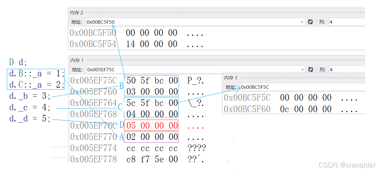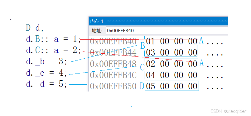 - 下图是菱形虚拟继承的内存对象成员模型:这里可以分析出D对象中将A放到的了对象组成的最下面,这个A同时属于B和C,那么B和C如何去找到公共的A呢?这里是通过了B和C的两个指针,指向的一张表。这两个指针叫虚基表指针,这两个表叫虚基表。虚基表中存的偏移量。通过偏移量可以找到下面的A。