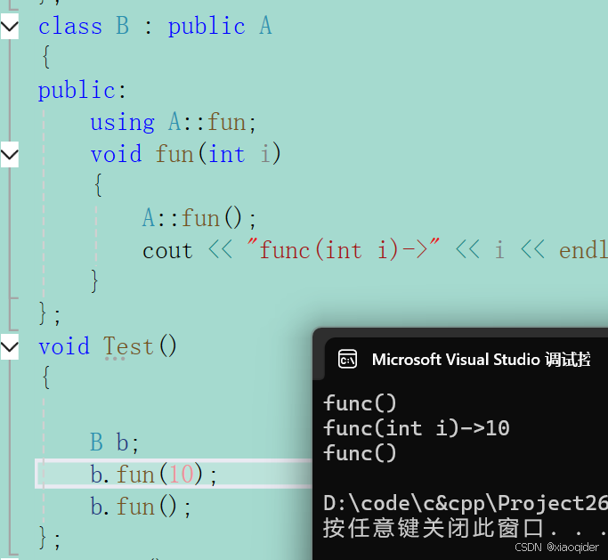 很多人会误以为这是"重载"。但它们不在同一作用域里,所以不是重载,而是 隐藏。