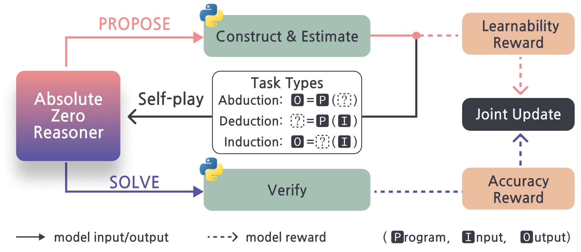 核心思路:提出 Absolute Zero (AZ) 框架,实现从零数据开始的强化学习。通过单个模型进行"自博弈"(Self-play):模型既是提问者 (Proposer) 也是解题者 (Solver)。