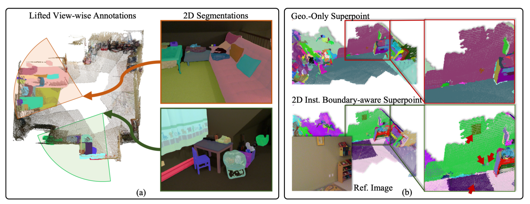 2. 给 点云 分组:把庞大的 3D 点云划分成一个个小的超级点(superpoint)。关键在于,划分不只是看几何结构是否连续(比如桌面上某块空白区域中的点彼此间很平滑、连续,则被归为一个超级点),还参考了 2D 分割结果作为判断超级点边界的依据(比如"相片"的点和"墙面"的点即使在几何结构上十分连续,也不会归为一组)。研究团队把这种划分方式称为"基于实例边界的超级点(IBSp,Instance-Boundary-aware Superpoint)"(如图 3 中的(b)所示)。IBSp 不仅提高了模型训练的稳定性,而且对于实际应用场景也十分有意义(用户通常没有3D传感器,输入通常为视频)。