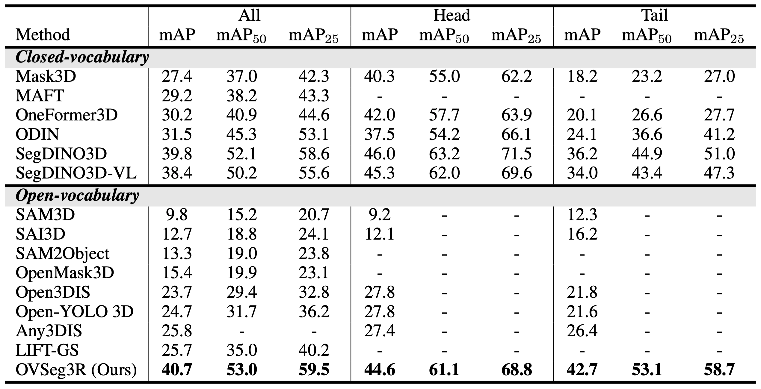 通过上述方案创新,OVSeg3R 在极具挑战性的 ScanNet200 3D 实例分割基准测试中,不仅大幅超越所有现有开集模型,同时刷新了闭集模型的最新记录,将长尾类与头部类的性能差距从 11.3 mAP 骤缩至 1.9 mAP,彻底改善类别性能不均衡问题。