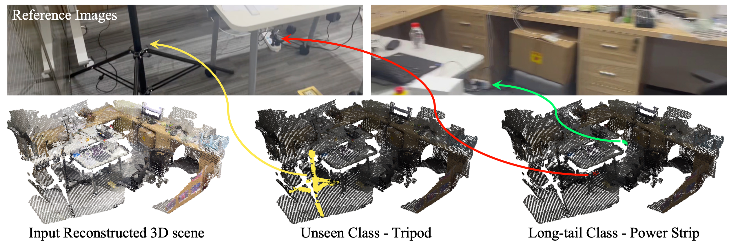 如图 6、图 7 所示,由于几何结构稀疏(比如三脚架)以及细小物体(比如瓶子、鼠标、插排)在充满噪声的点云上进行人工标注的难度很高,因此在现有数据集中,这些类别的缺失十分严重,导致已有算法无法处理这些类别。但 OVSeg3R 依然能将这些物体稳定地识别并分割出来。