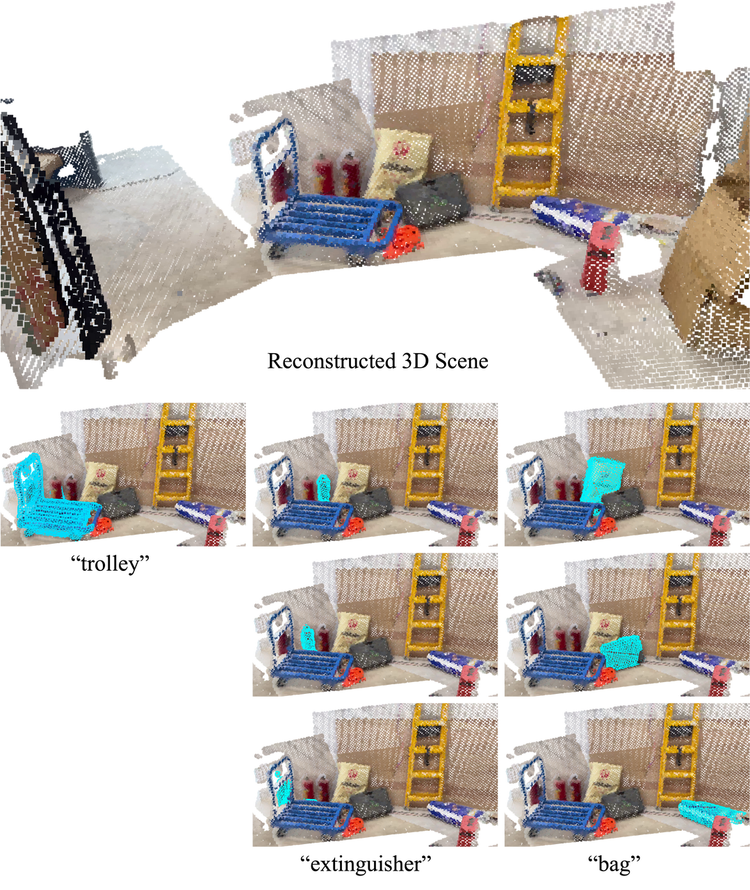 4. 生成分视角标注:把每个视角的 2D 分割结果,通过 2D 与 3D 的对应关系投影到 3D 空间,生成每个视角对应的子场景 3D 标注(如图 3 中的(a)所示)。