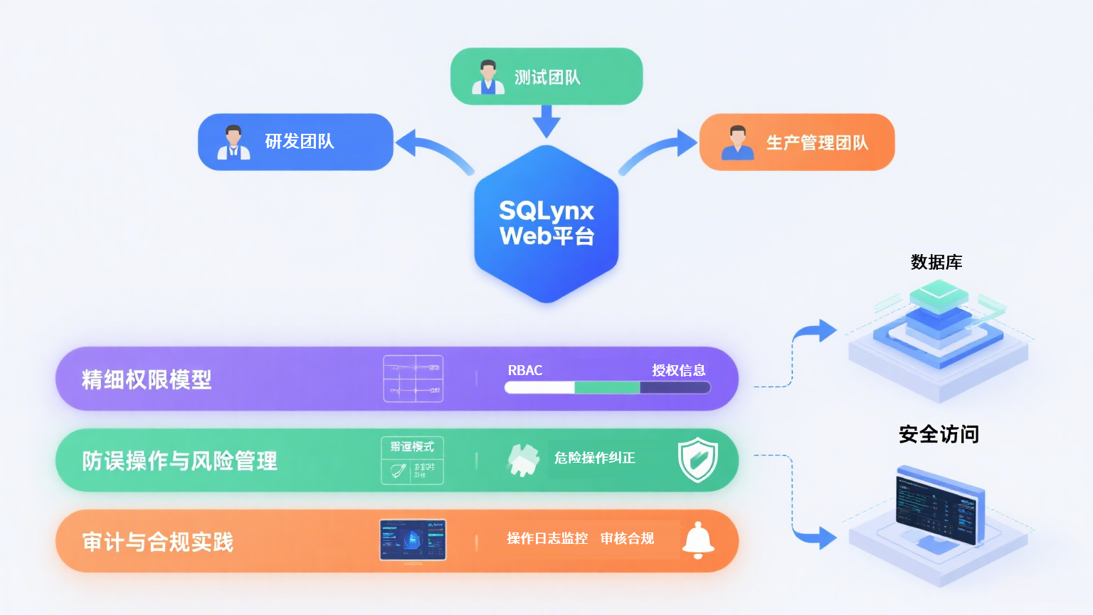 针对上述痛点,某金融科技企业采用了基于 Web 架构的 SQLynx 企业版,替代了传统的"堡垒机+客户端"模式,构建了"事前防御 + 事中控制 + 事后审计"的全链路闭环。
