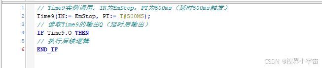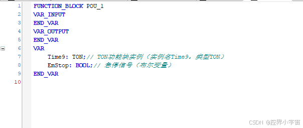 注意:同一FB类型可实例化多个对象(如Time9、),实例名在同一POU中不可重复,各自的内部状态独立(如Time9的延时计数不影响其他定时器)。