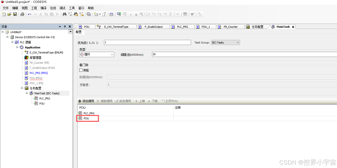 程序(PRG)是POU中最大的单元,作为全局逻辑的核心载体,可调用函数、功能块及其他程序,需绑定任务才能执行。其核心作用是整合分散的POU模块,实现完整的控制流程。