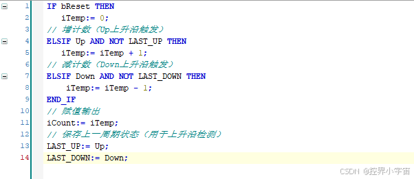- 实例化调用:在主程序中声明FB实例,调用并测试计数逻辑。