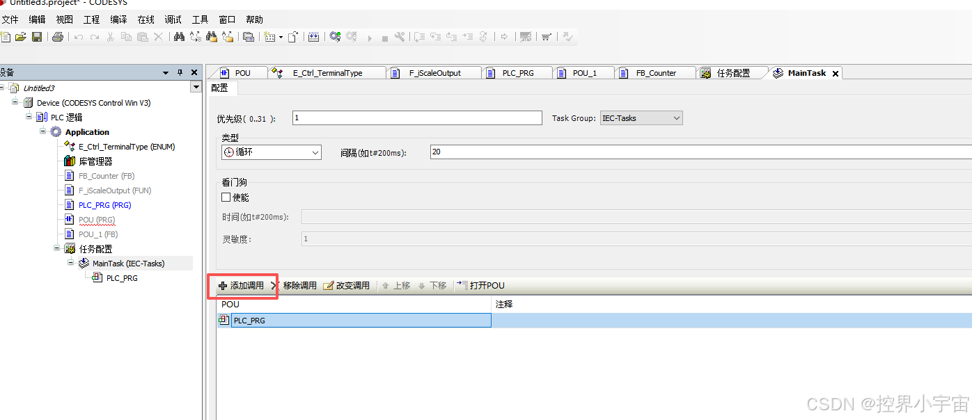 - 右键目标任务(如循环任务),选择"添加对象"→"程序调用";
