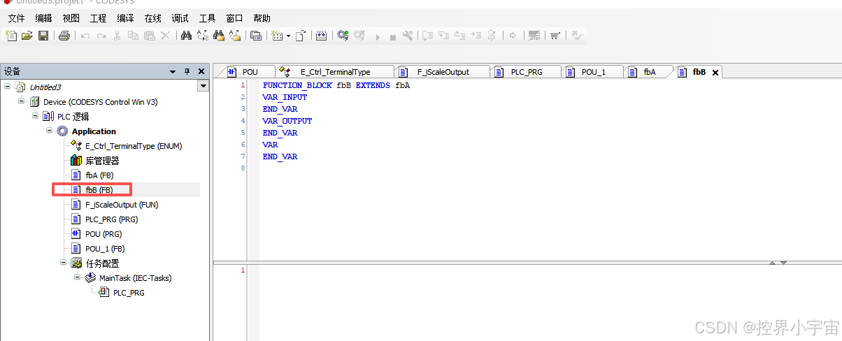- 新建子FB(fbB),在声明行添加"EXTENDS fbA",继承父FB属性;