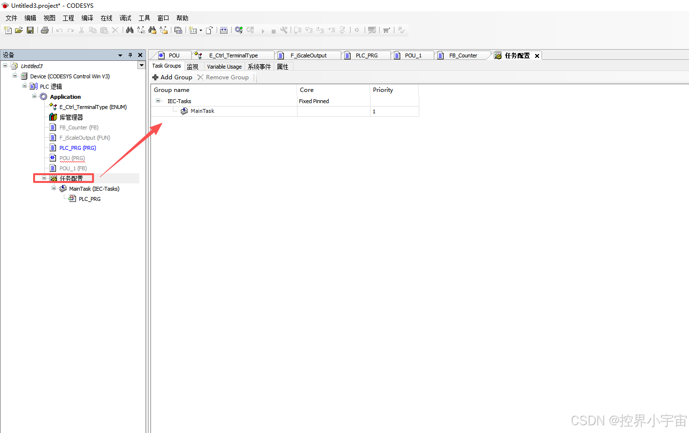 - 在左侧项目设备树中,找到"任务配置",双击打开;