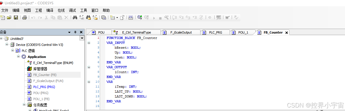 自定义一个FB(FB_Counter),实现增计数、减计数、复位功能,步骤如下: