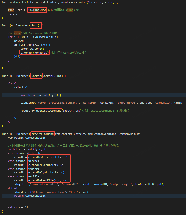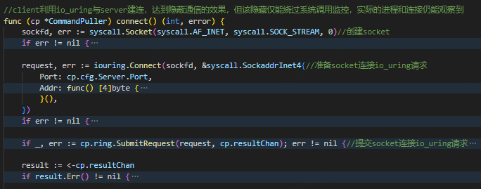 以curing为例(链接:https://github.com/armosec/curing),它利用io_uring实现client端与server端通信并执行C2指令,以绕过某些安全检测工具达到一定的隐藏效果。下图分析了curing client与server端建立通信的逻辑。
