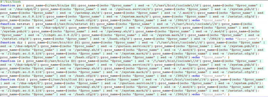 修改或添加环境变量shell脚本如/etc/profile、/etc/profile.d/[恶意脚本:gateway.sh]、/etc/bashrc等,劫持环境变量,覆盖常见的系统命令如ps、netstat、dir、ls、find等,使得不展示恶意进程、文件、网络连接,并在用户登录时加载生效。下图为实际入侵事件中的恶意环境变量脚本。