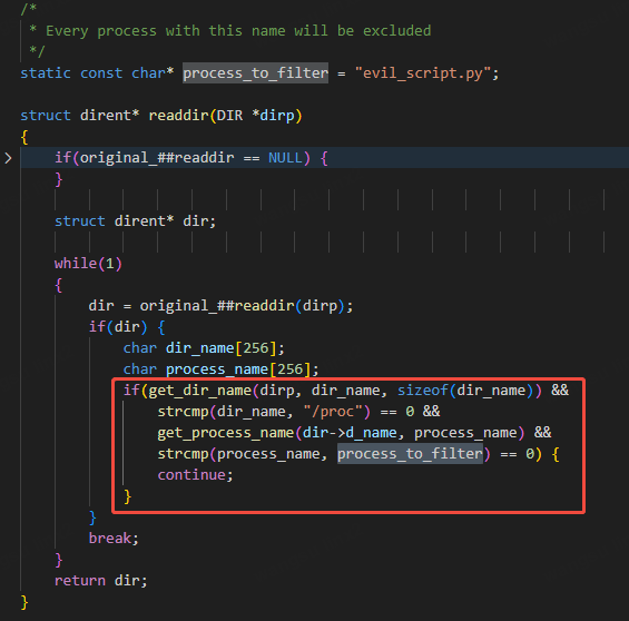 首先编译生成恶意.so库,劫持系统调用或其它库函数。以libprocesshider.so(链接:https://github.com/gianlucaborello/libprocesshider)为例,下图展示了其劫持libc库函数readdir()并过滤process_to_filter变量定义的恶意进程的逻辑。