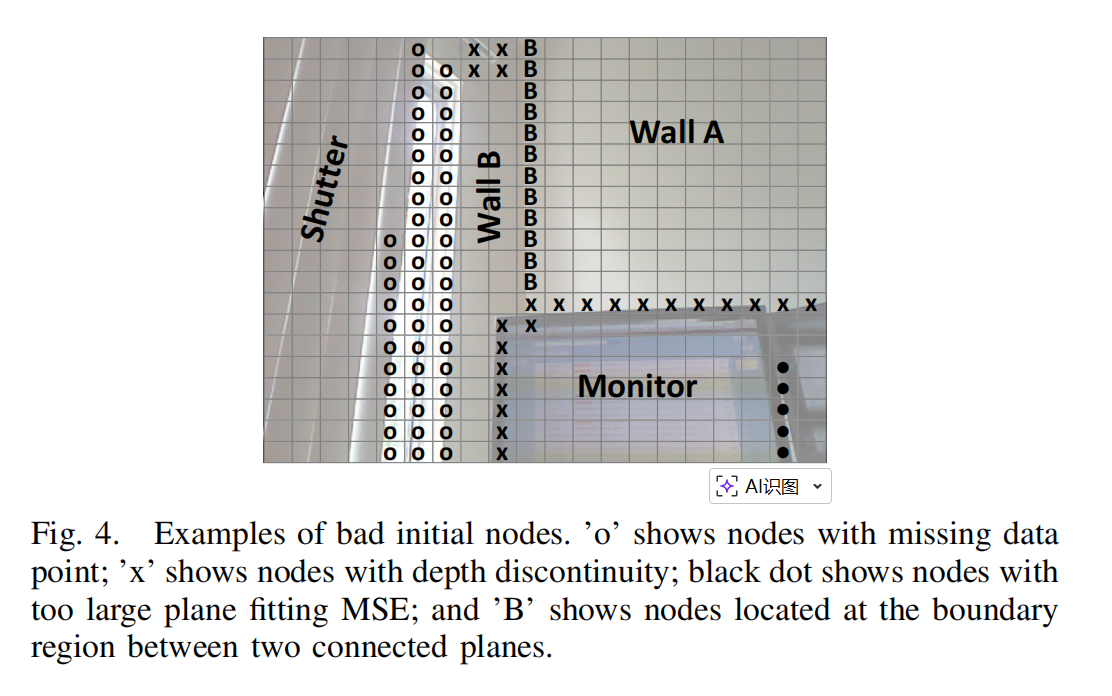 - 包含深度不连续的节点:这些节点包含两组在 3D 中不接近但在图像空间接近的点(通常一个表面部分遮挡另一个表面,例如显示器遮挡墙壁)。如果对该节点执行 PCA 拟合平面,拟合平面会几乎平行于视线方向,因此 MSE 仍然较小。将该"异常"节点与邻居节点合并,会对平面拟合结果产生不良影响,这是最小二乘法过度加权异常值的已知问题。