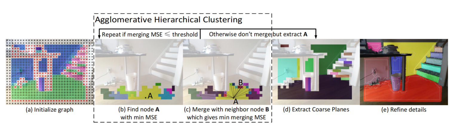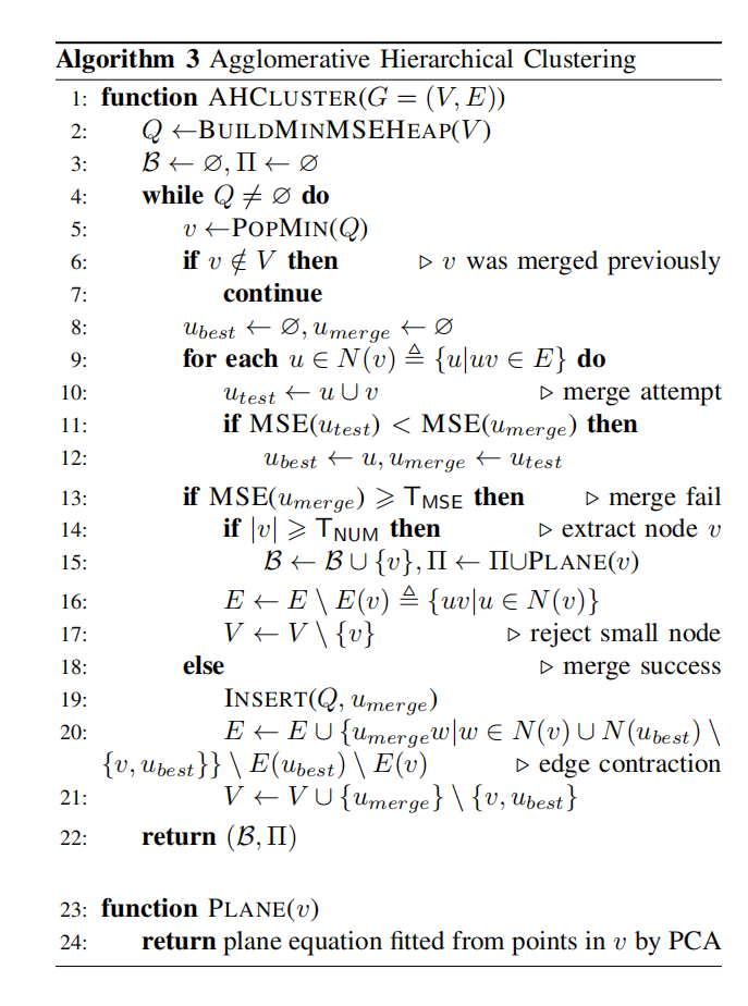 - 然后执行 自底向上的层次聚类 (AHC, Agglomerative Hierarchical Clustering) 提取粗平面;