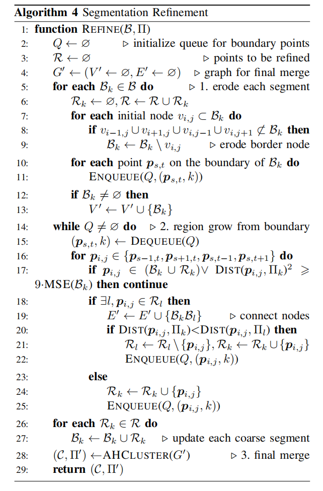 在区域生长过程中,发现每个平面 BkB_kBk 的 4-邻域 ,形成一个新的图 G′G'G′(算法第 14--27 行)。