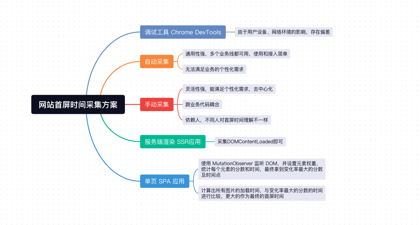 Chrome DevTools拿到的首屏时间存在偏差。 - 手动采集方案较为灵活,能满足个性化需求,去中心化,但没有自动采集通用性好,会跟业务代码耦合,接入成本也更高,会受人为影响,所以一般都会选择自动化采集方案。