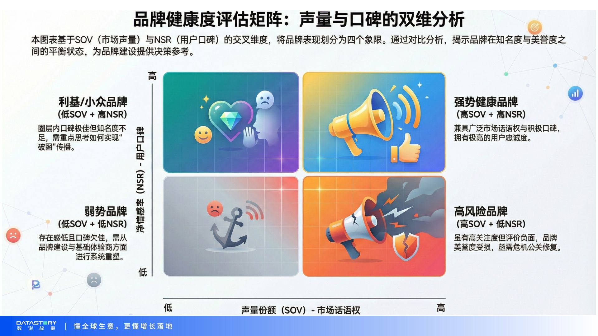 单独看SOV或NSR都可能产生误判,一个品牌SOV很高,可能是由于负面事件引发的全民讨论(NSR极低);另一个品牌NSR很高,但可能仅限于小众圈层(SOV很低)。真正的品牌健康,追求的是 "高SOV"与"高NSR"的协同增长,二者结合,可以形成一个强大的品牌诊断矩阵: