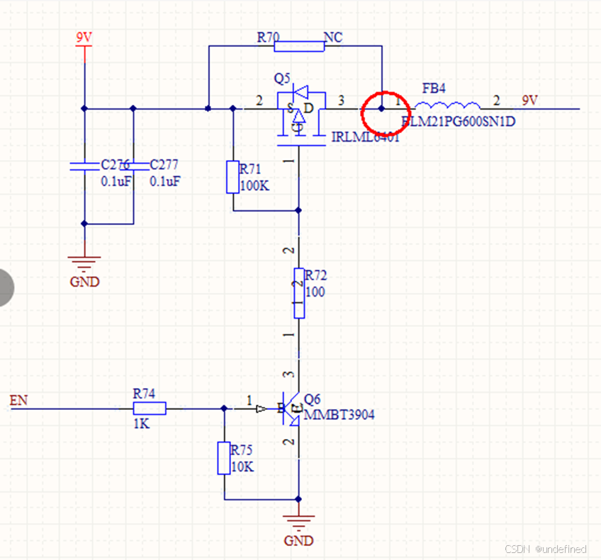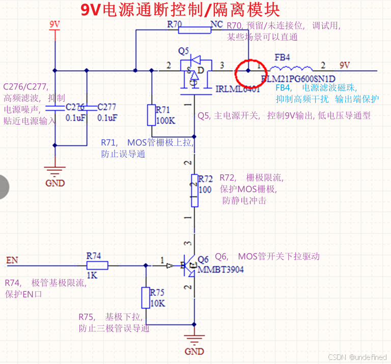 Q5为P沟道MOSFET,从9V电源向后级输出提供主电源通断功能。当MOS管栅极被拉低时导通,9V通过FB4进入后级负载。