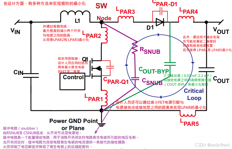**方案1是增加吸收电路。**在MOS管的D-S两端并联一个RC缓冲电路(Snubber)或TVS二极管,用于吸收和钳位这个尖峰电压。Snubber的连接电路可以参考下面案例