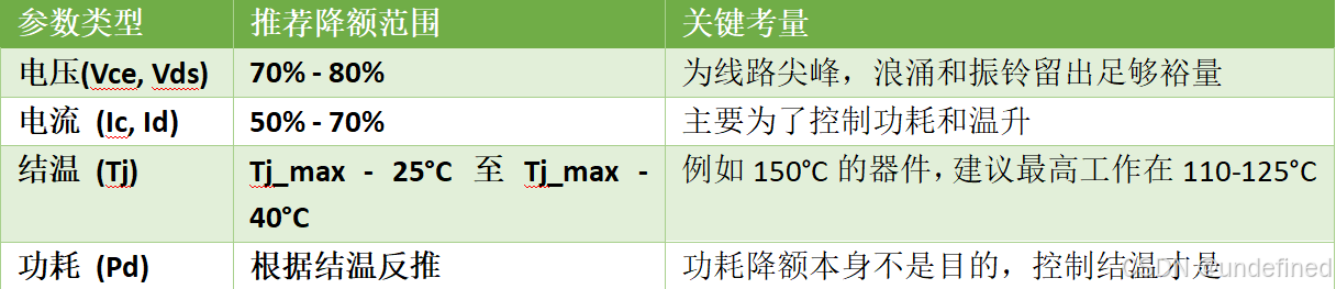 | 结温 (Tj) | Tj_max - 25°C至Tj_max - 40°C | 例如150°C的器件,建议最高工作在110-125°C |