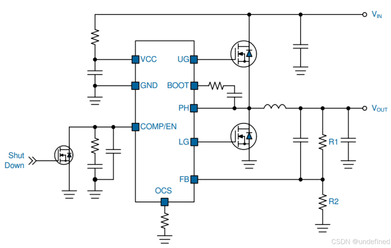 设计目标: 设计一个同步Buck降压转换器,将24V输入转换为12V输出,负载电流为10A,开关频率f_sw为200kHz。大概的方案框图如下