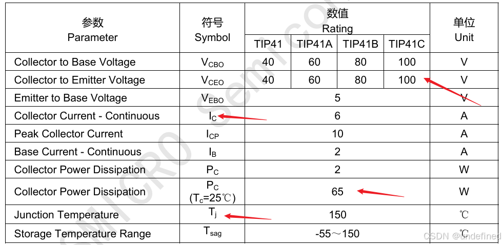 初步分析: 查阅TIP41C数据手册,关键参数如下: