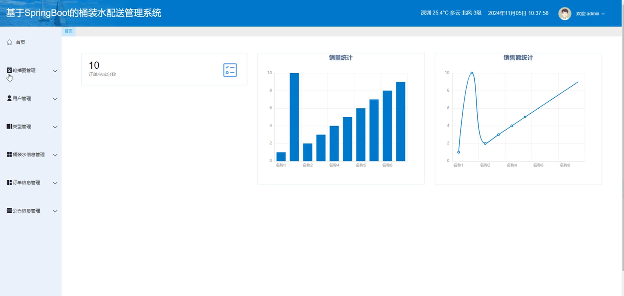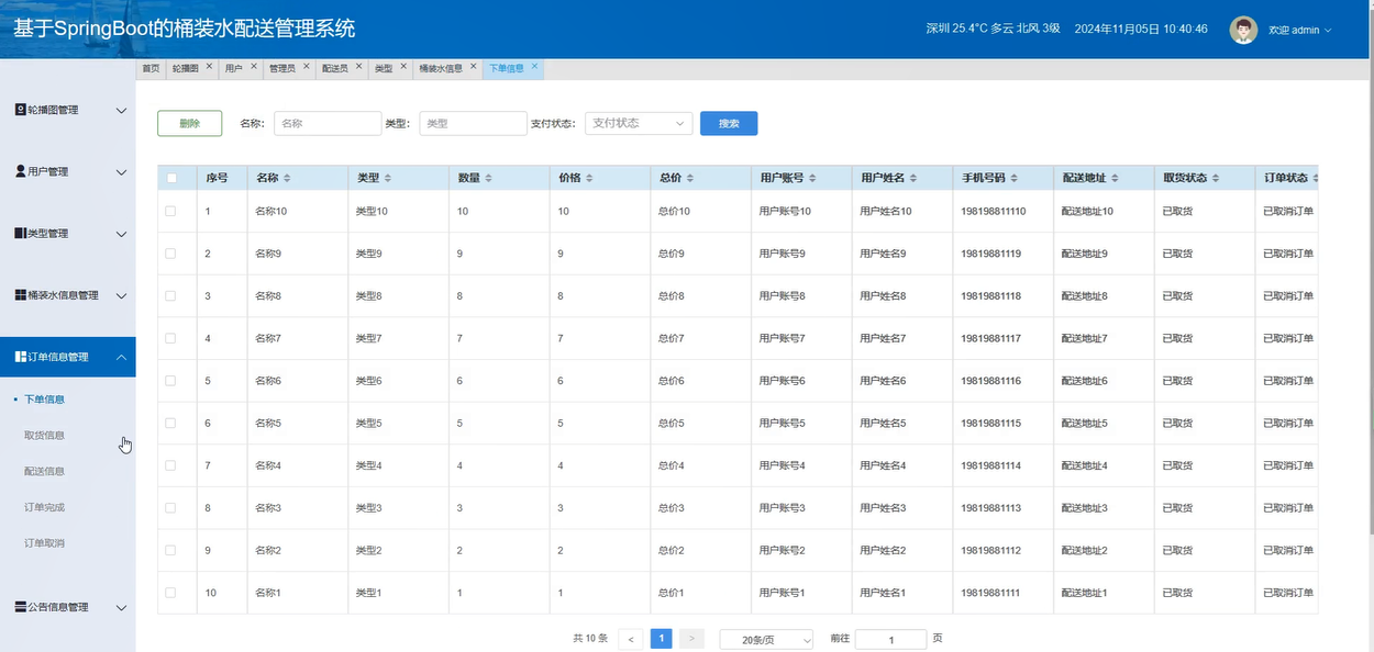 业务管理:桶装水信息管理(新增、修改、删除、回复评论),订单全流程管理(查看下单、取货、配送、完成、取消订单信息及用户基础信息)。