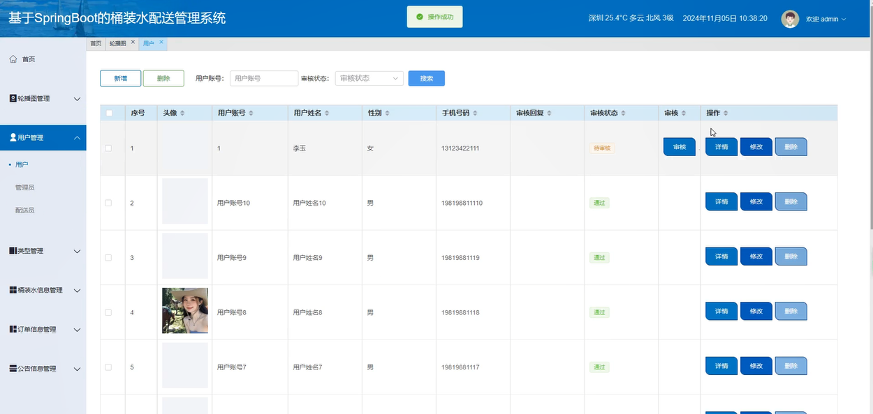 权限管理:管理员账号登录,用户信息管理(新增、修改、审核用户及配送员账号);