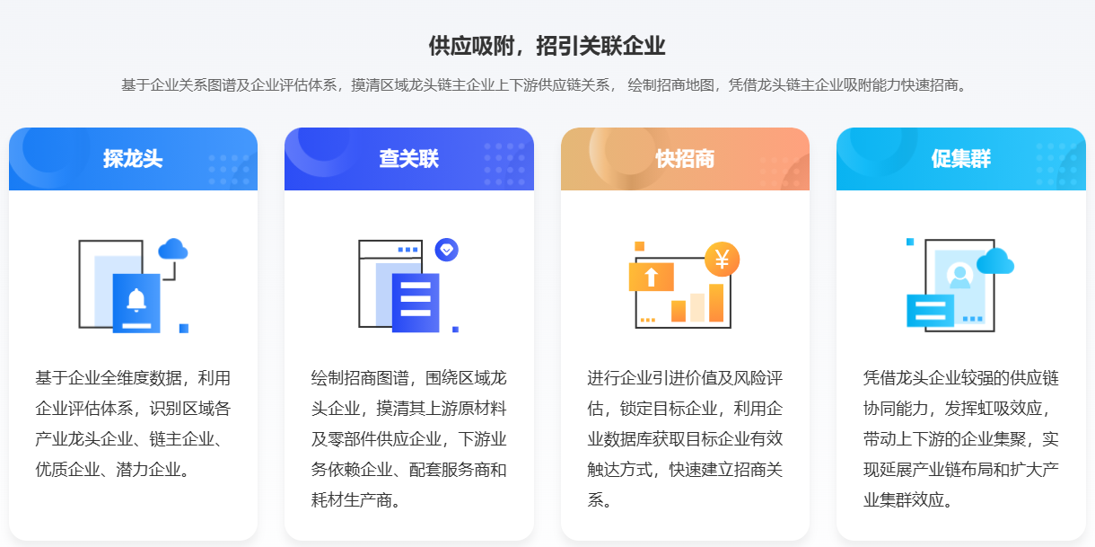 破解招商痛点,实现"精准选商、高效引商、风险可控"。传统招商面临"线索少、匹配度低、管理散"的难题,产业数据信息库通过三大功能破局:一是"精准寻商",基于产业链图谱锁定区域紧缺的目标企业,生成高质量招商线索,替代"广撒网"式招商;二是"科学选商",通过企业综合能力与投资意愿分析,筛选出适配区域产业规划的优质企业,避免无效对接;三是"闭环管理",建立招商全流程数据追踪机制,实时掌握线索跟进、项目落地进度,同时预警企业入驻后的经营风险,大幅提升招商效率与质量,助力区域产业集群化发展。