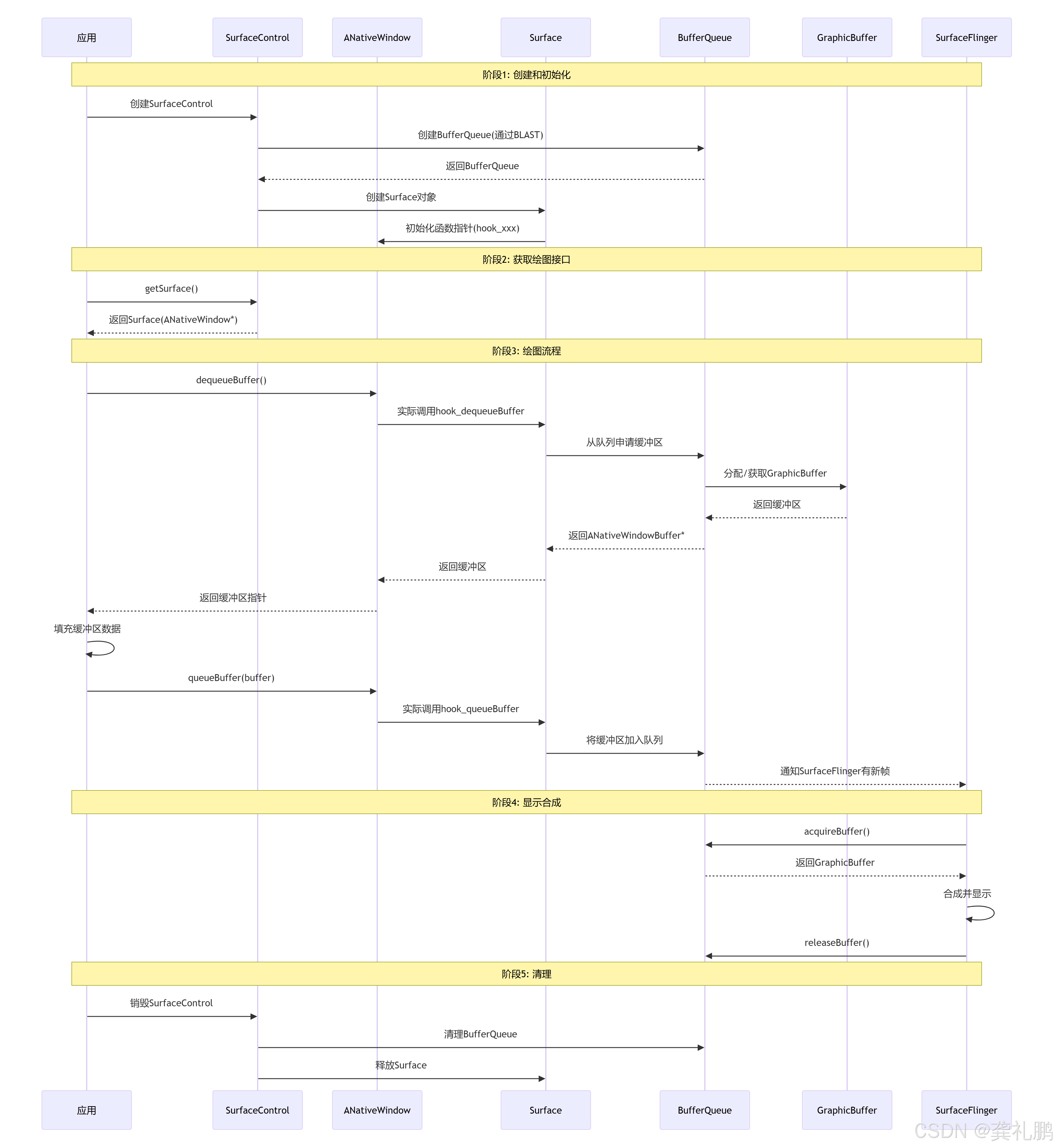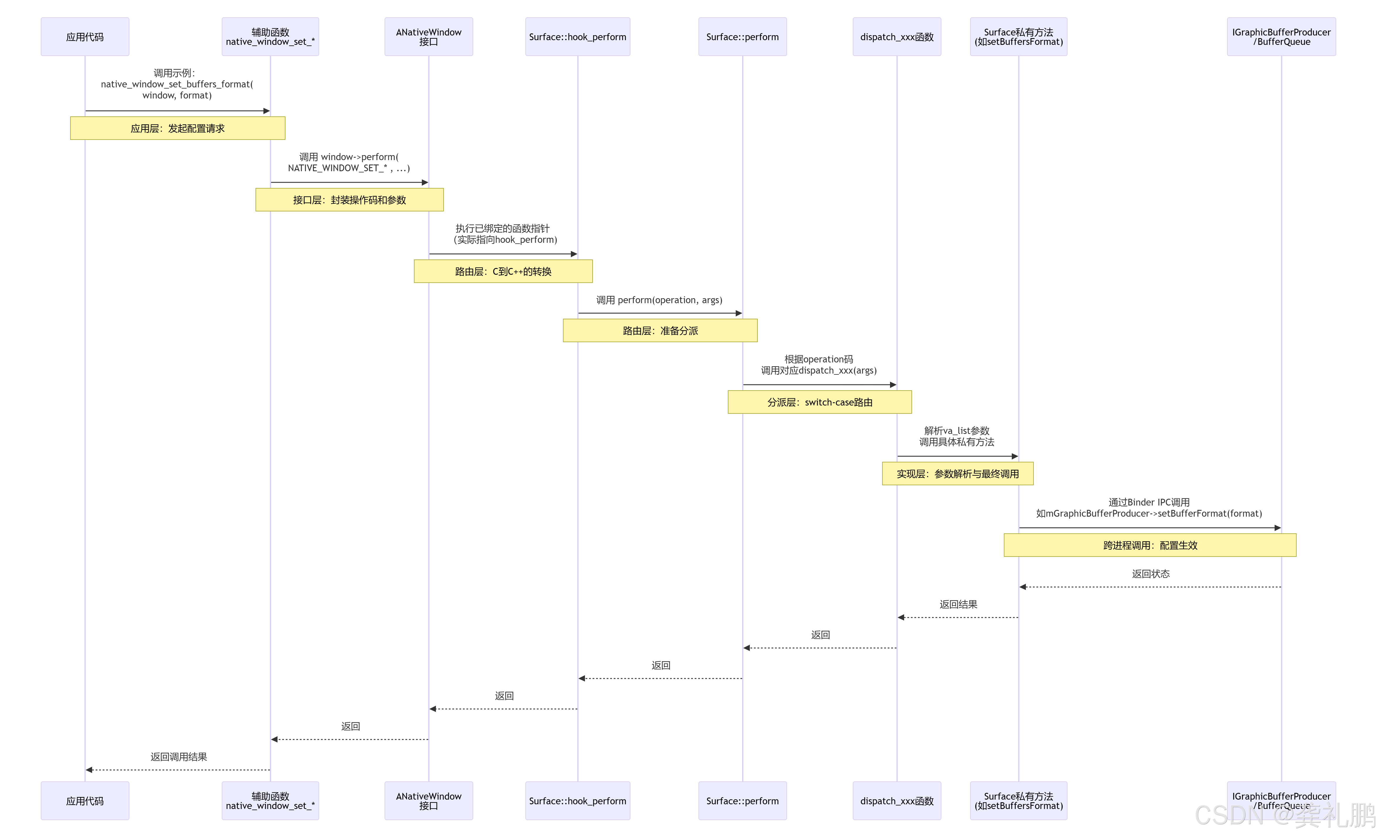 ANativeWindow(或其实现类Surface)作为生产者 接口,其核心函数如dequeueBuffer和queueBuffer操作的对象正是ANativeWindowBuffer。生产者通过dequeueBuffer获取一个ANativeWindowBuffer来填充内容,完成后通过queueBuffer将其送回队列等待消费者(如 SurfaceFlinger)使用。