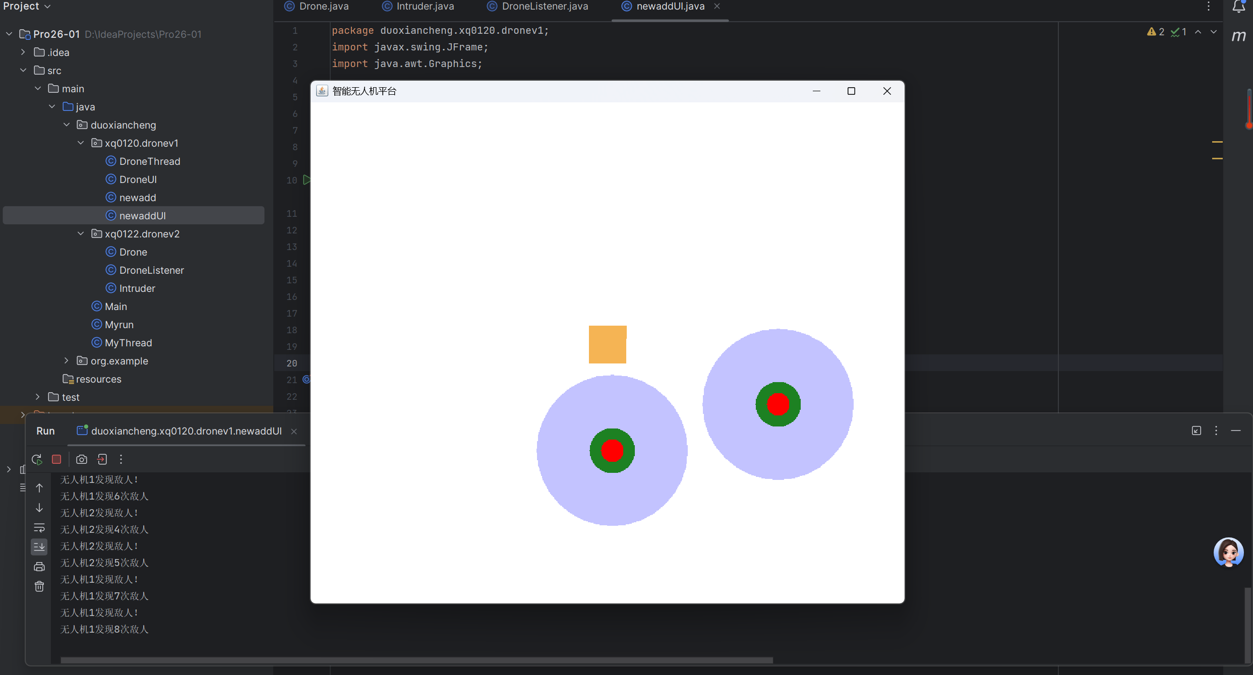 通过多线程实现无人机在UI界面的自主移动,利用Thread子类处理绘图与运动逻辑,实现双无人机独立运动。