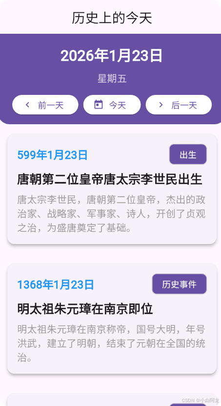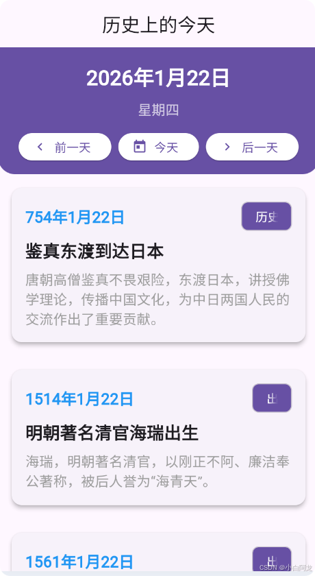 "回看历史"是一款基于鸿蒙+Flutter开发的跨平台应用,旨在为用户提供"历史上的今天"相关信息。用户可以通过该应用查看当天的历史事件,也可以切换不同日期,了解对应日期发生的重要历史事件。