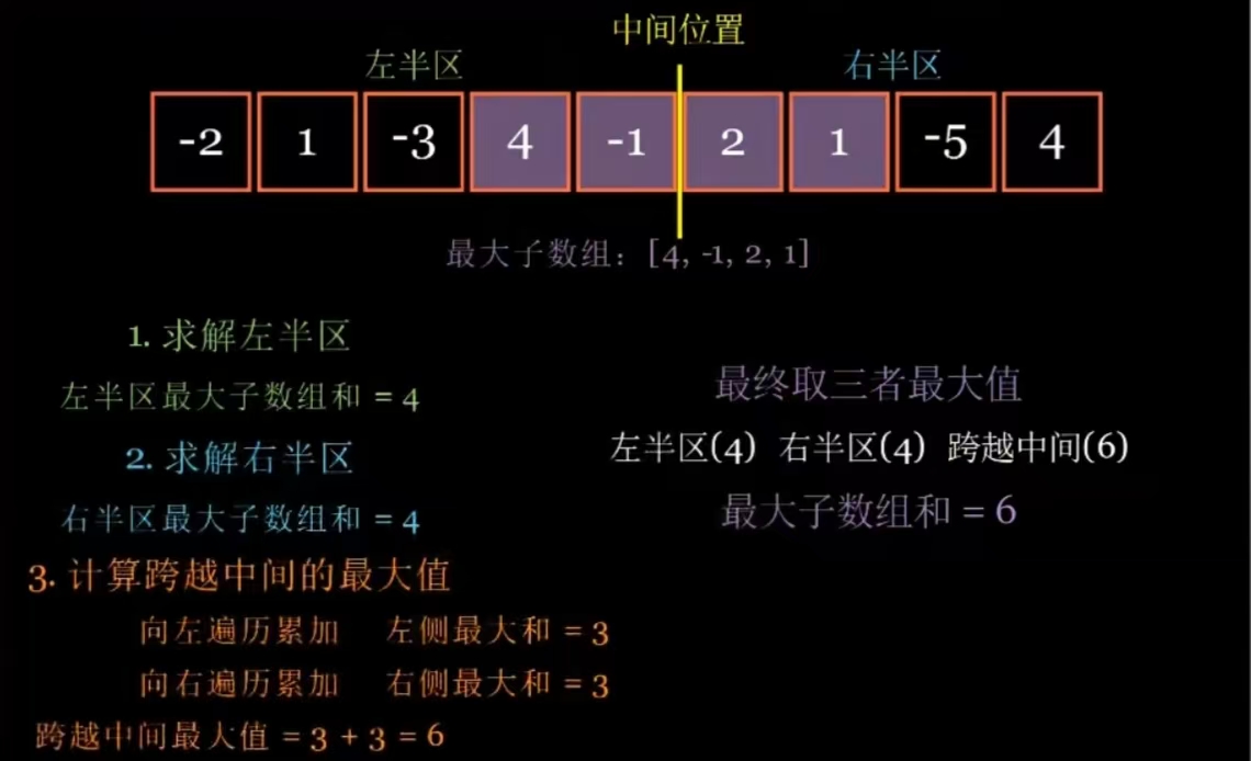 对于这个题目,我们可以把数组从中间分成左右两个部分,那么最大子数组只会出现在三个地方:完全在左半部分、完全在右半部分、跨越中间位置(左半部分有一点右半部分有一点,拼接起来)。所以我们只需要分别求出这三个位置的最大子数组和,然后取其中的最大值,就是整个数组的最大子数组和。