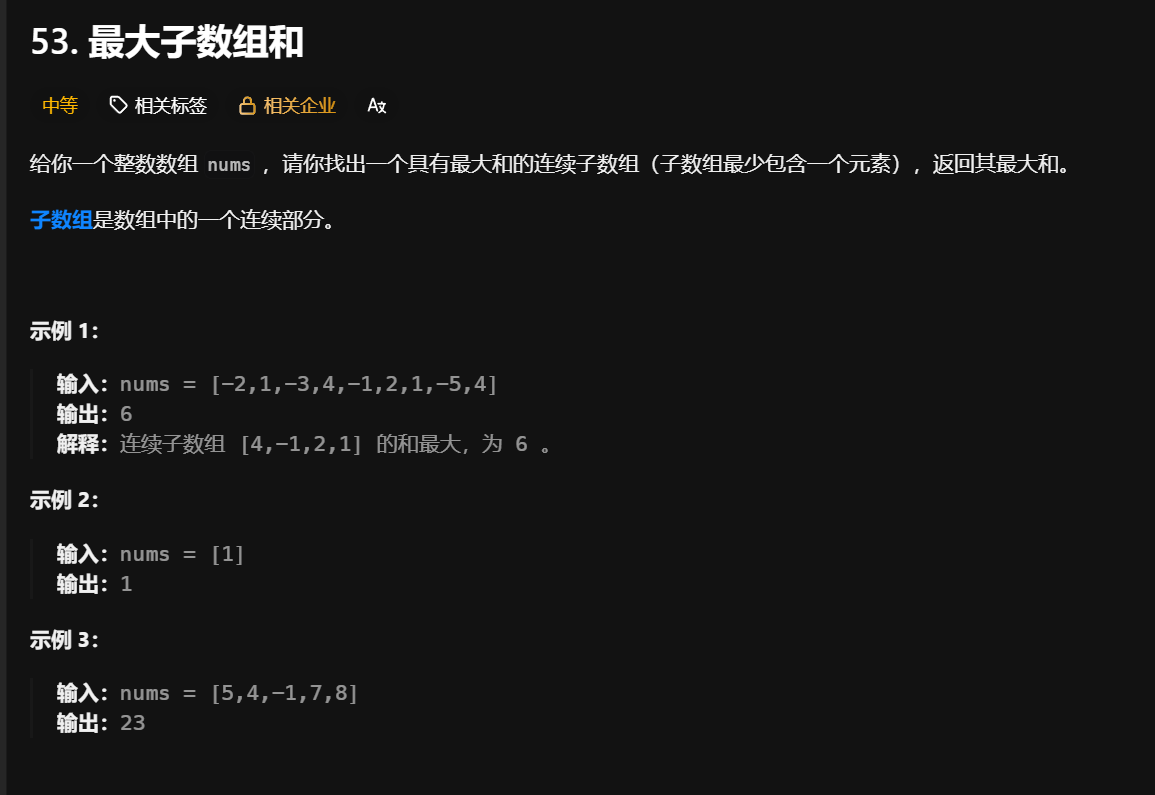 示例1中的最大子数组就是[4,-1,2,1]这一段,他的元素和是6,是所有子数组中元素和最大的,所以6就是这个问题的答案。