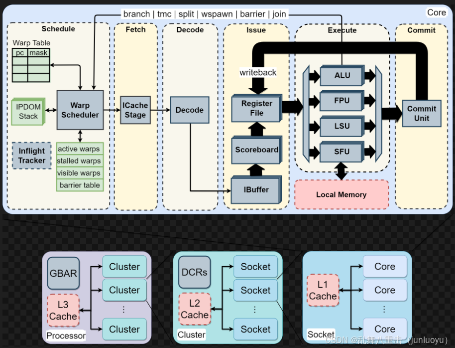第五块是Execute,里面包含四个模块,分别是ALU,看名字就是一个矩阵计算的;FPU,看名字是一个浮点数计算用的;LSU,不知道;SFU,这里用来做了6条指令,就是图片中的branch,tmc,split,wspawn,barrierr,join,他们的实现都在SFU去完成。