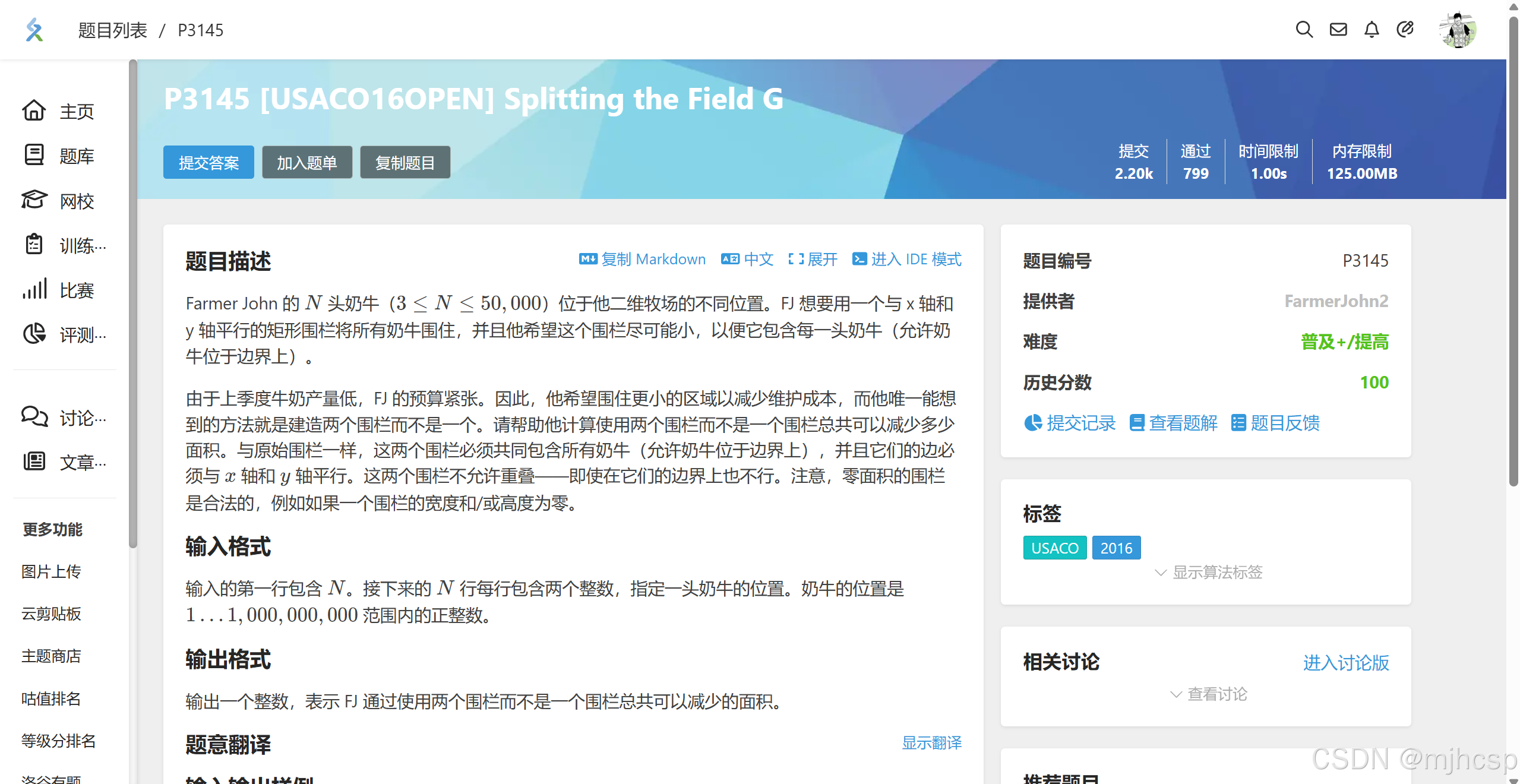 Farmer John 的 N N N 头奶牛( 3 ≤ N ≤ 50 , 000 3 \leq N \leq 50,000 3≤N≤50,000)位于他二维牧场的不同位置。FJ 想要用一个与 x 轴和 y 轴平行的矩形围栏将所有奶牛围住,并且他希望这个围栏尽可能小,以便它包含每一头奶牛(允许奶牛位于边界上)。