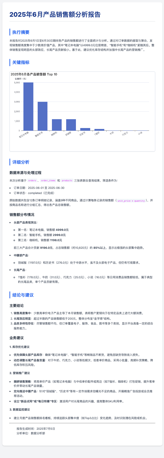 本报告对2025年6月1日至6月30日期间各产品的销售额进行了全面统计与分析。通过对订单数据的提取与聚合,发现销售额高度集中于少数高价值产品,其中"笔记本电脑"以4999.0元位居榜首,"智能手机"和"咖啡机"紧随其后。整体销售呈现明显的头部效应,长尾产品贡献较小。基于此,建议优化库存结构并加强中长尾产品的营销推广。