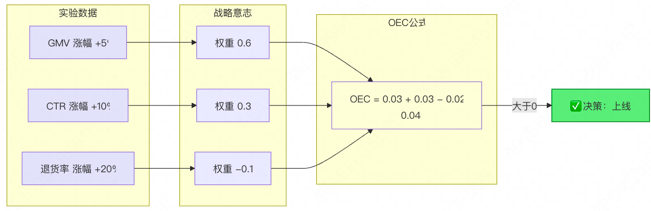 因为 OEC = 0.04 > 0 ,说明虽然退货率涨了,但 GMV 和点击率带来的正向收益足够大,完全覆盖了退货带来的负面损失。