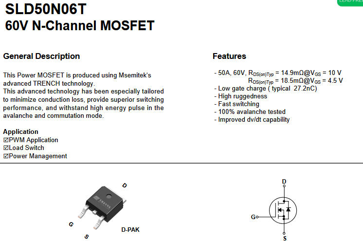 | SLD50N06T | 60V | 50A | 14.9mΩ | 48nC | 68mJ | D-PAK |