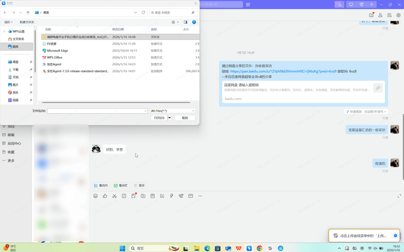它控制鼠标自动打开了桌面的钉钉客户端,搜索联系人,上传刚才生成的PPT,并点击发送。