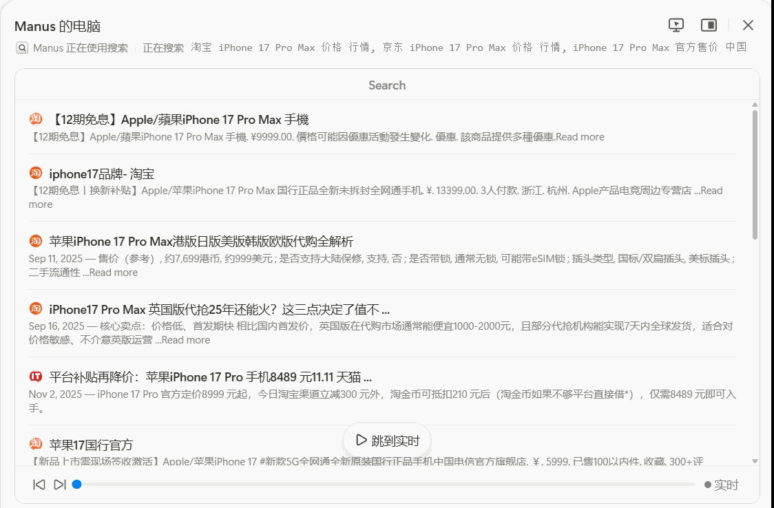 面对电商平台的登录墙和反爬机制,Manus采取了更为通用的策略:它调用搜索引擎(如Google/Bing),检索了大量关于iPhone 17 PM的新闻报道和预测文章。
