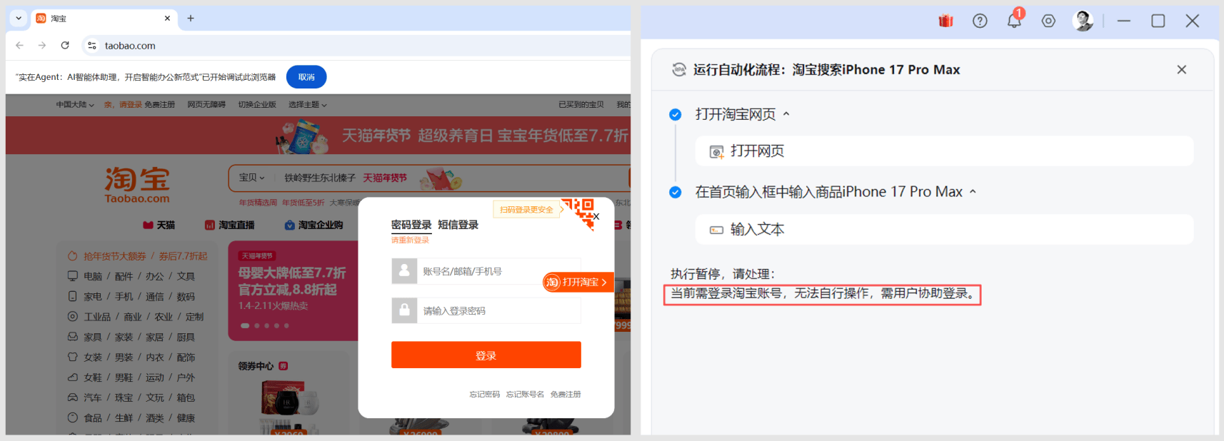 视频中,当遇到登录界面时,它能暂停等待用户安全验证(或自动处理),随后直接进入淘宝和京东的商品详情页,读取实时的价格与销量数据。