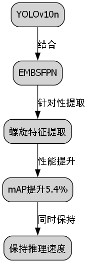 从表中可以看出,虽然YOLOv10n本身已经表现出色,但与EMBSFPN结合后,mAP指标提升了5.4个百分点,同时保持了较快的推理速度。这种性能提升主要归功于EMBSFPN对螺旋特征的针对性提取能力。