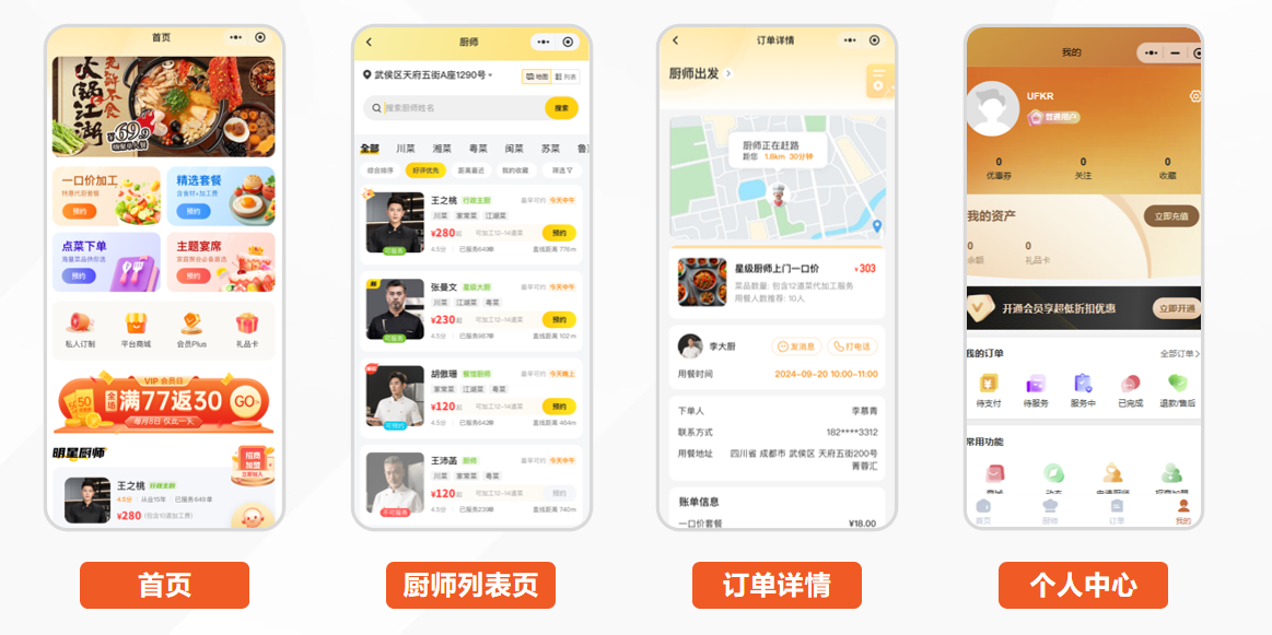对用户来说,上门做饭图的就是便捷:点开就能下单,一眼看清厨师擅长川菜还是粤菜、有没有健康证,不用反复沟通扯皮;对厨师来说,最在意的是安心:订单明细一目了然,收款不拖不欠,自己的资质能清晰展示,不用怕被恶意投诉;对你(平台方)来说,要的是省心:订单能一键管理,用户、厨师数据随时查看,遇到纠纷能快速处理,不用天天忙得焦头烂额。