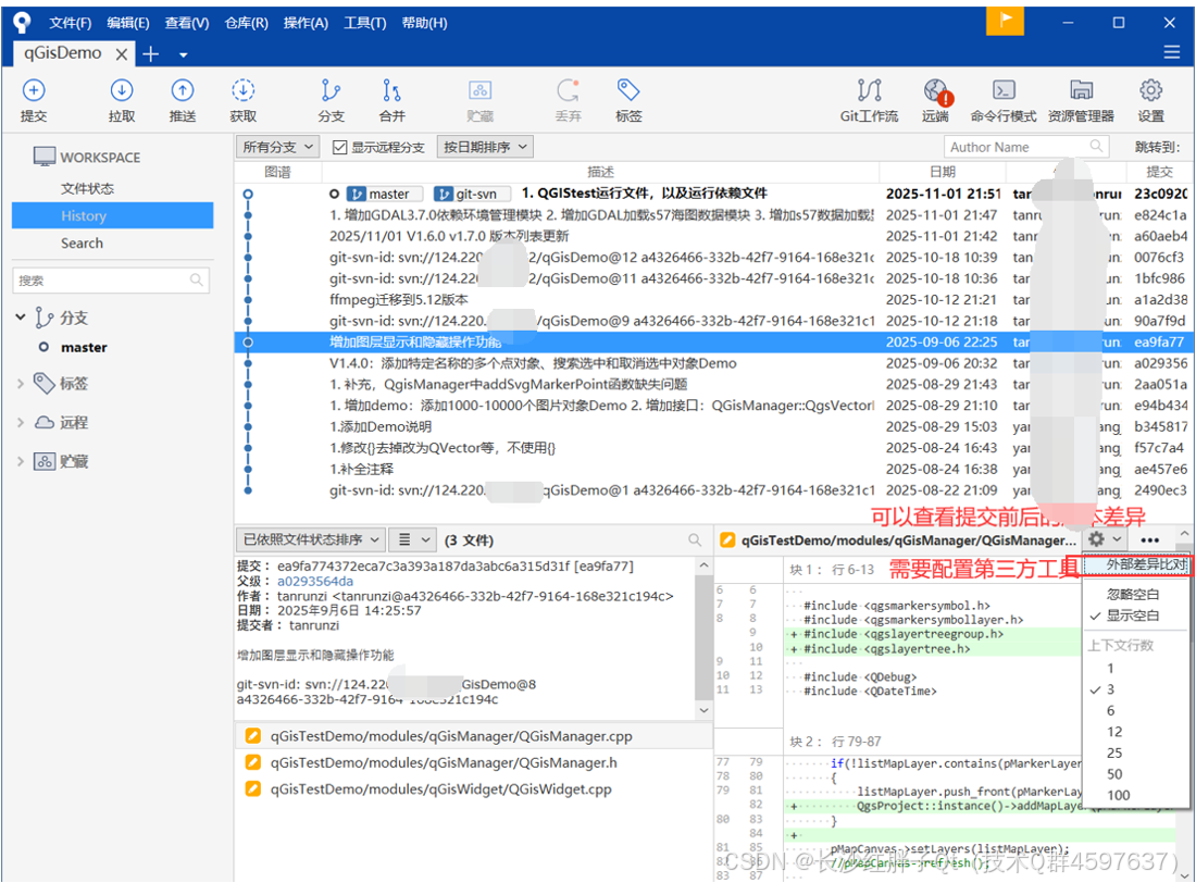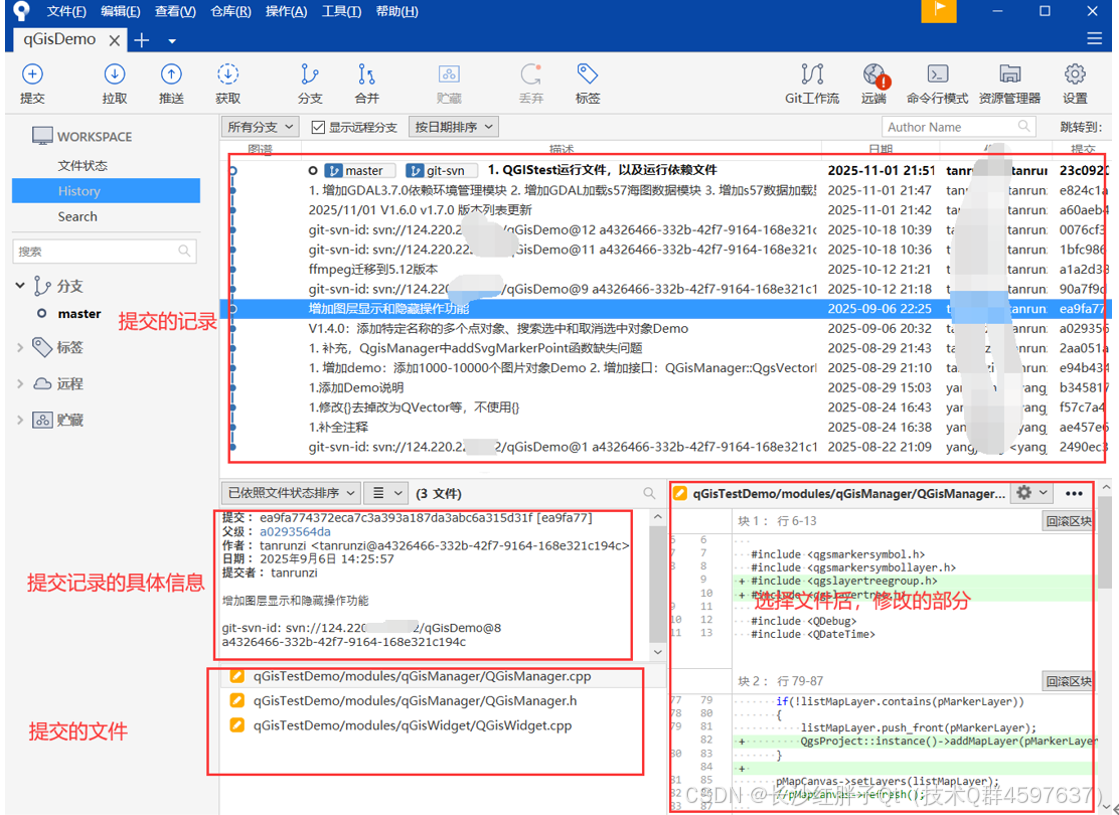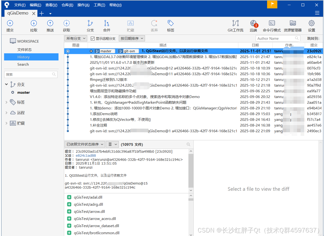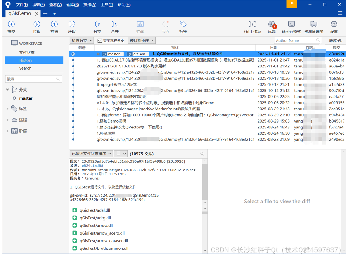 然后添加后,将之前svn的各种版本信息也都类似于git管理展示出来了: