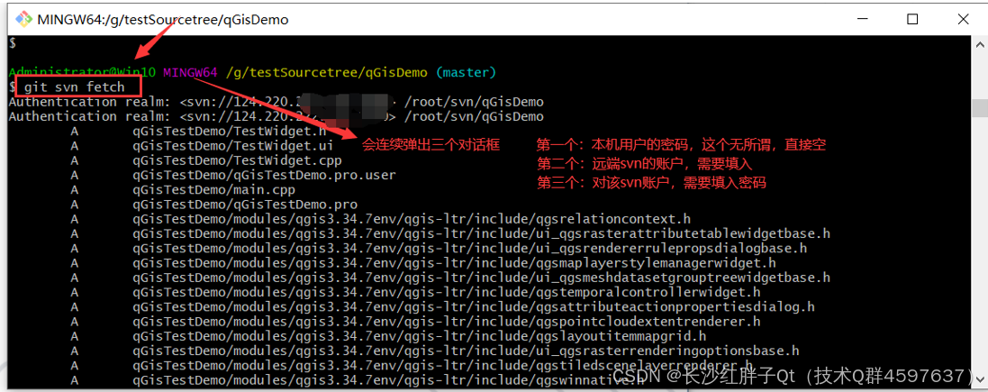 在git命令行中进行fetch,这样弹出三个方框进行输入svn的账户和密码等信息,可以fetch。
