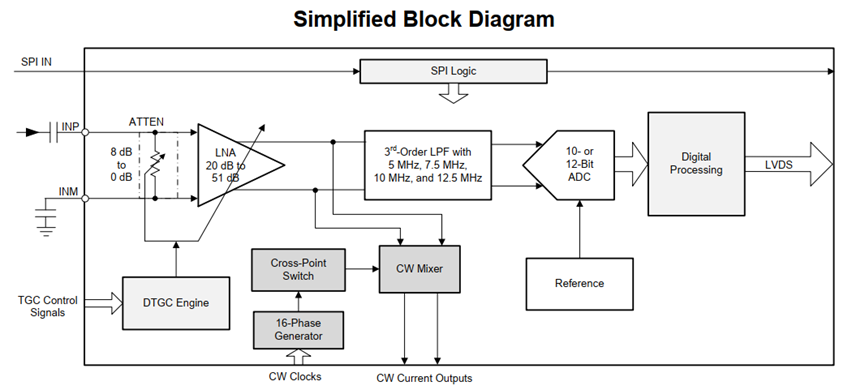 上图为单通道模块示意图,由SPI控制寄存器,LVDS输出数据,还有TGC等复杂增益控制;